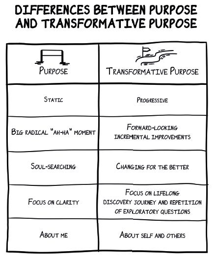 In my latest work, I make a distinction that changed everything for me: Purpose vs. Transformative Purpose. Purpose is often static and self-oriented.